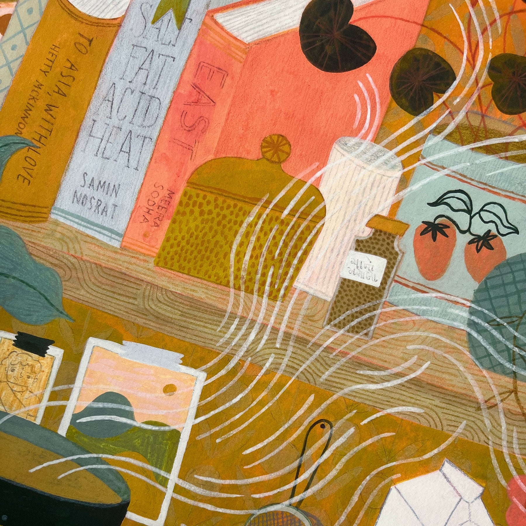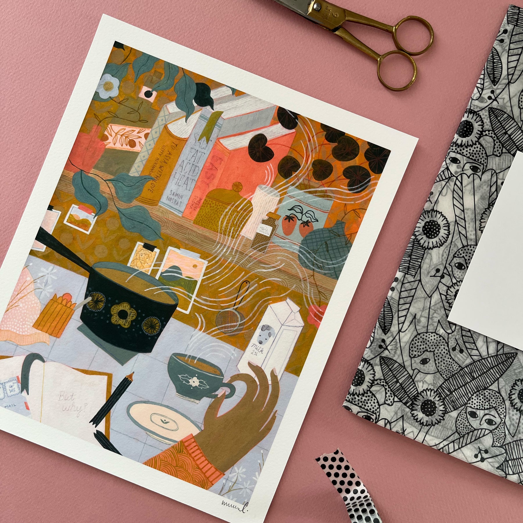 An art print featuring a warm, cozy morning cha / chai moment. Inspired by the idea of food rituals as memory.