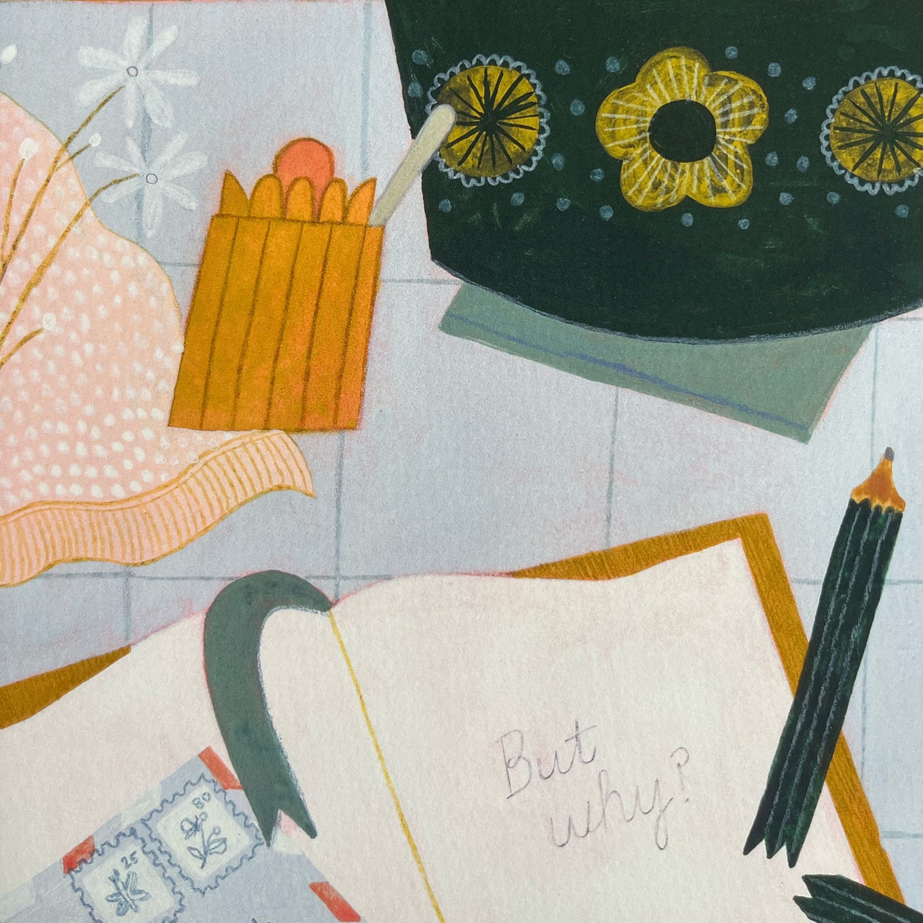 I love working with both traditional and digital mediums. Either way, all of my art starts out with a very rough and tiny pencil sketch. From there I refine the outlines of the art at the final size until I’m happy with the underdrawing. My favorite parts of the process are playing with color and layering in all the pattern details.